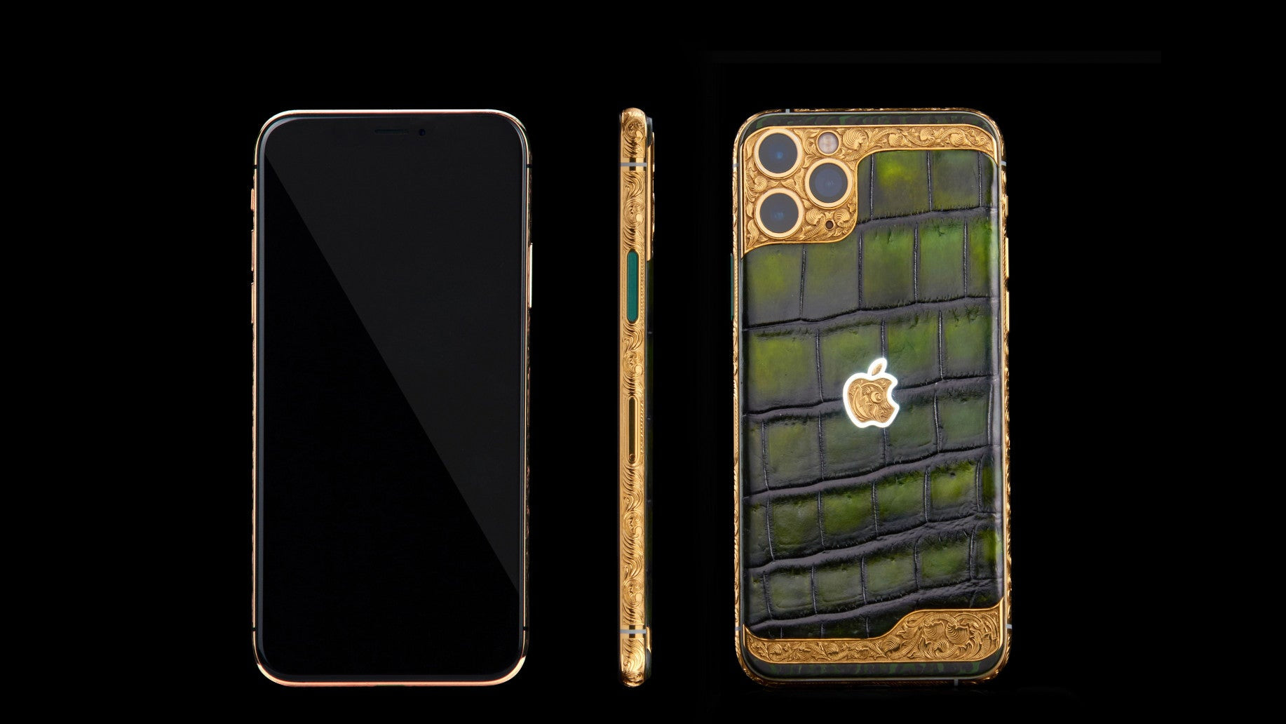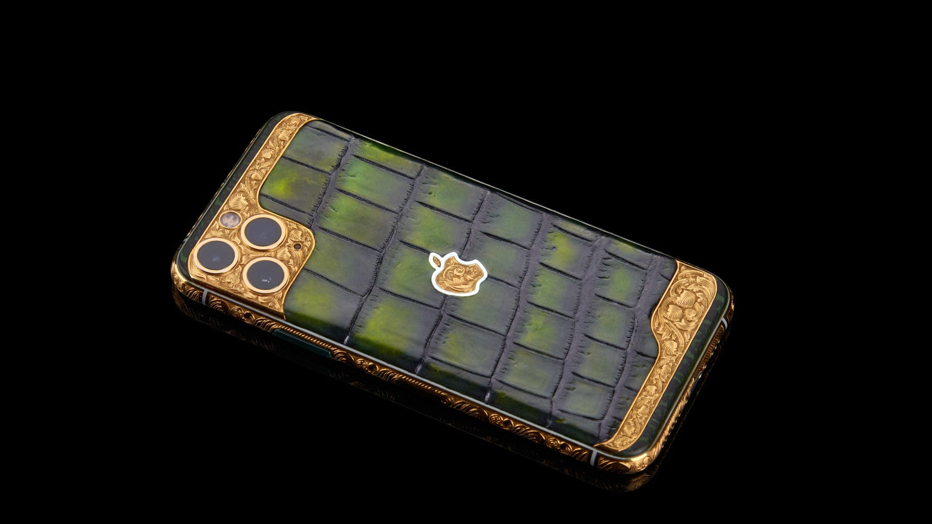 Das Vintage Eastern Emerald iPhone 17 Pro Max ist mit vintage-smaragdgrünem Alligatorleder bezogen und mit einem vergoldeten, beleuchteten Apple-Logo sowie handgefertigter Gravur veredelt.